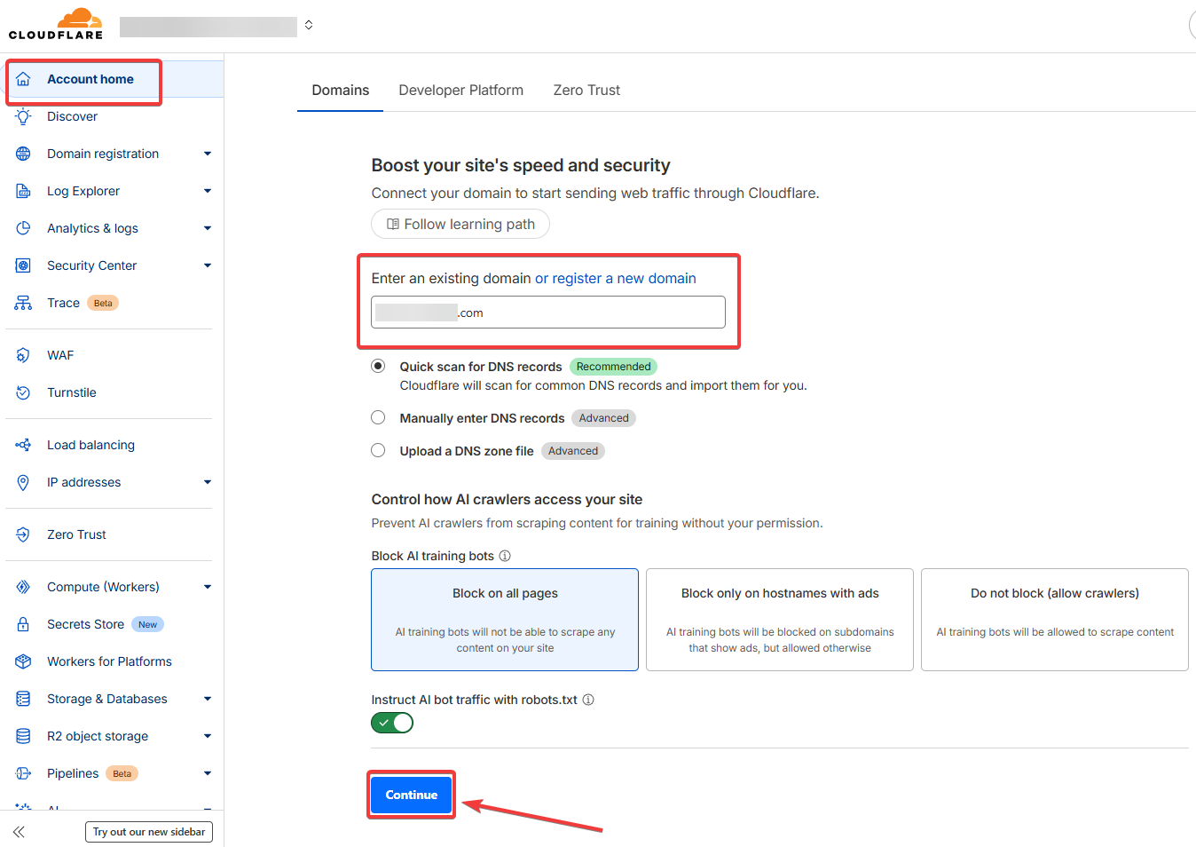 На главной странице введите свой домен и кнопку Продолжить