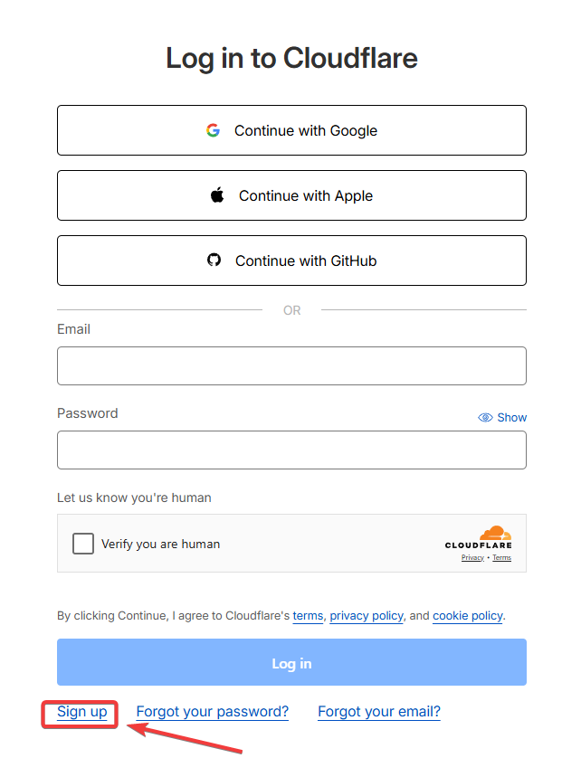 Пройдите регистрацию Cloudflare по ссылке https://dash.cloudflare.com/login