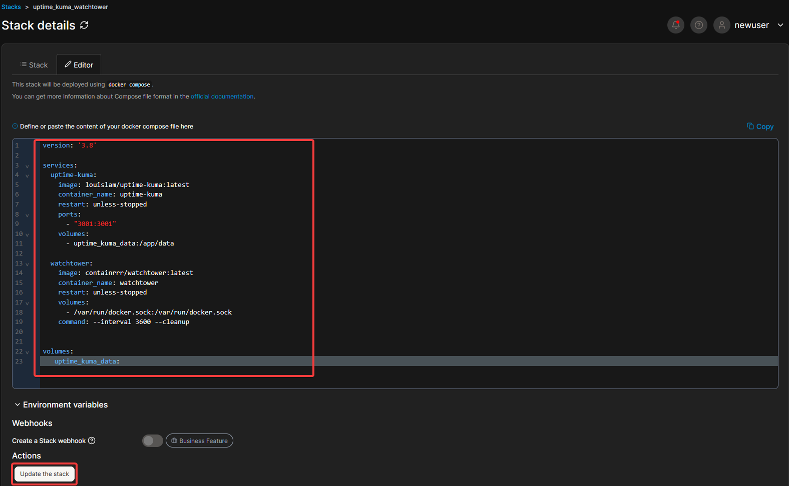 Чтобы пересоздать контейнер с учетом новых данных - вставьте новый код compose в свойствах стека в меню Editor, и нажмите Update stack
